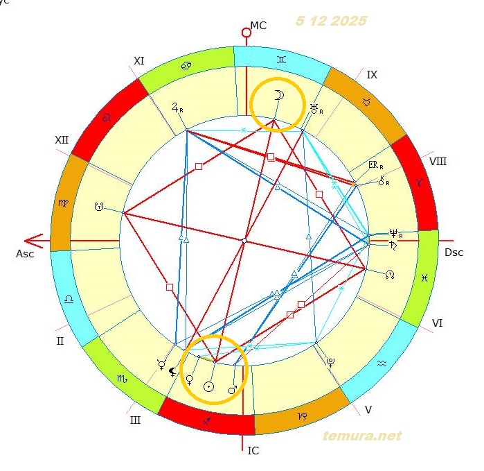 Важна особеност на пълнолунието в Близнаци от 5 декември е съпътстващия квадрат на оста Луна-Слънце с тази на лунните възли. Той се разполага в 13-я градус на четирите знака от подвижния кръст – Близнаци-Дева-Стрелец-Риби. Кармичният характер на лунните възли слага отпечатък върху пълнолунието. Тази конфигурация създава интензивно напрежение между Ума и Духа, като основният урок тук е да се опираме на анализа и вникване в подробностите, но да дадем приоритет на интуицията и визията за бъдещето. Да разберем, че всички ние се намираме в период на дълбоко емоционално пречистване, което ни учи да бъдем по-състрадателни, разбиращи и човечни.