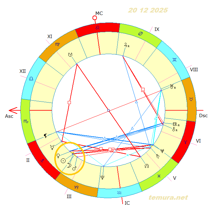 В сряда, 17 декември, Слънцето застава в ежегодния си низходящ квадрат към Сатурн в 25° Стрелец-Риби. Този аспект създава напрежение между оптимизма, вярата и експанзията, характерни за Слънце в Стрелец и ограниченията, отговорностите и реализма на Сатурн в Риби. Може да почувстваме тежест или разочарование, тъй като плановете ни се сблъскват с реалността. В международен план, в седмицата преди Коледа, това може да доведе до конфликти на етническа и религиозна основа. Протести може да има освен у нас и в други страни.