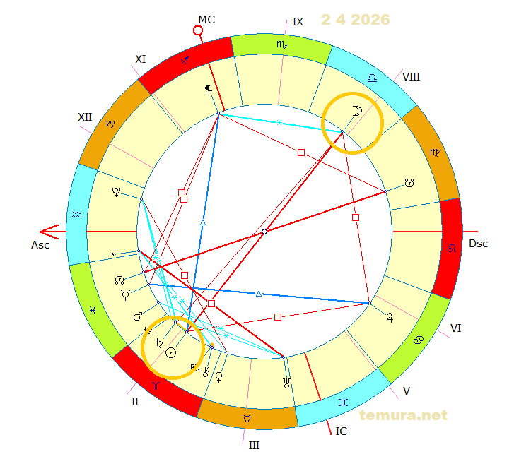 Пълнолунието в 12 градуса на Везни, което настъпва в ранните часове на четвъртък – 2 април, е критичен момент за дипломацията. Везните управляват дипломацията и търсят баланс, но Пълнолунието често изкарва наяве всичко скрито. То може да донесе или пробив в индиректните преговори през трета страна, или окончателен срив на комуникацията. Включването на Юпитер в Рак, който образува напрегнати квадрати към оста на Пълнолунието, внася елемент на прекален експанзионизъм и защита на национално-битовите интереси за сметка на общото равновесие.